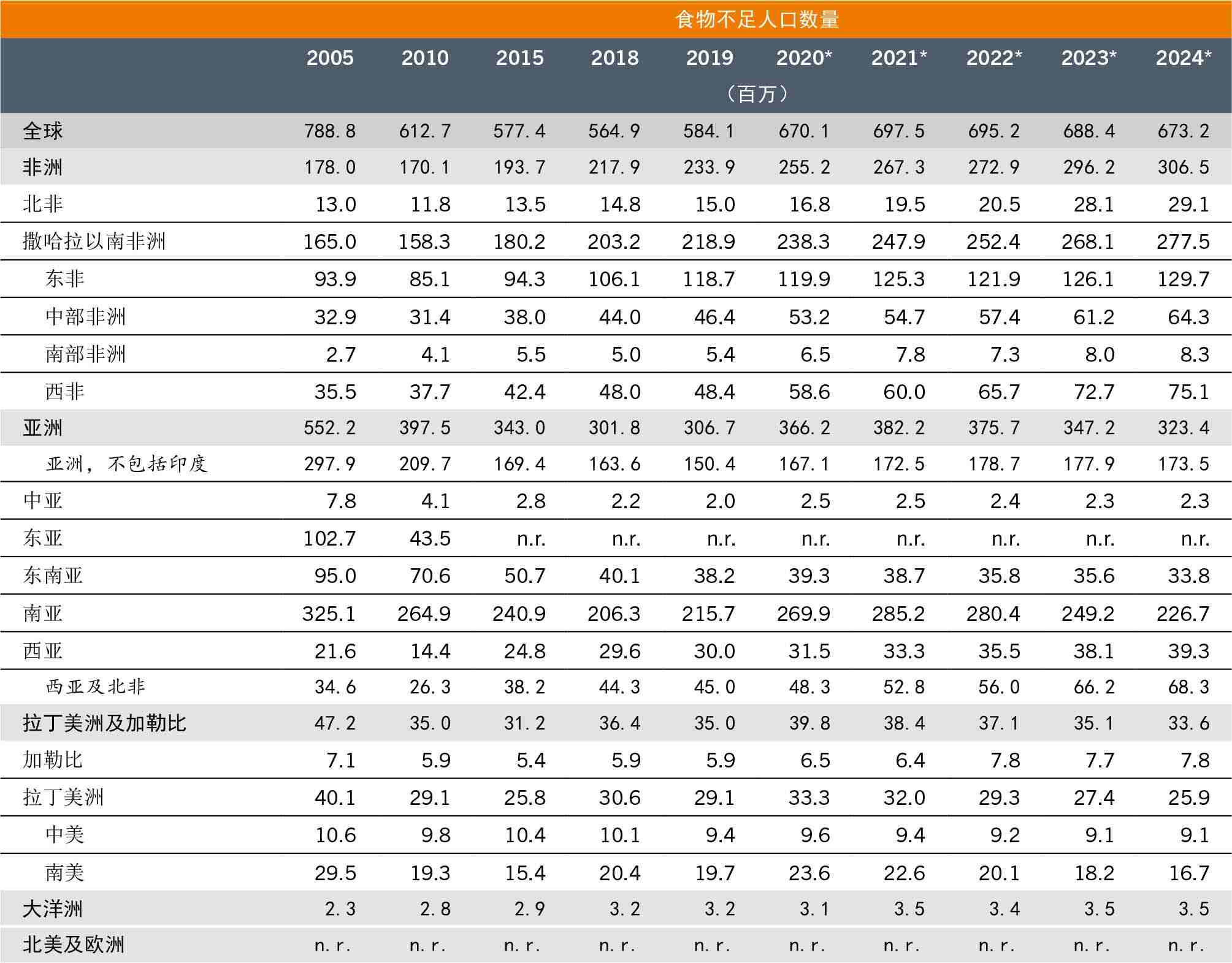 考虑以上结果时,应牢记,一些国家受人道主义危机影响,其粮食不安全形势在不断恶化,这一点可能未充分反映在2024年食物不足发生率快报中(见插文2.2)。