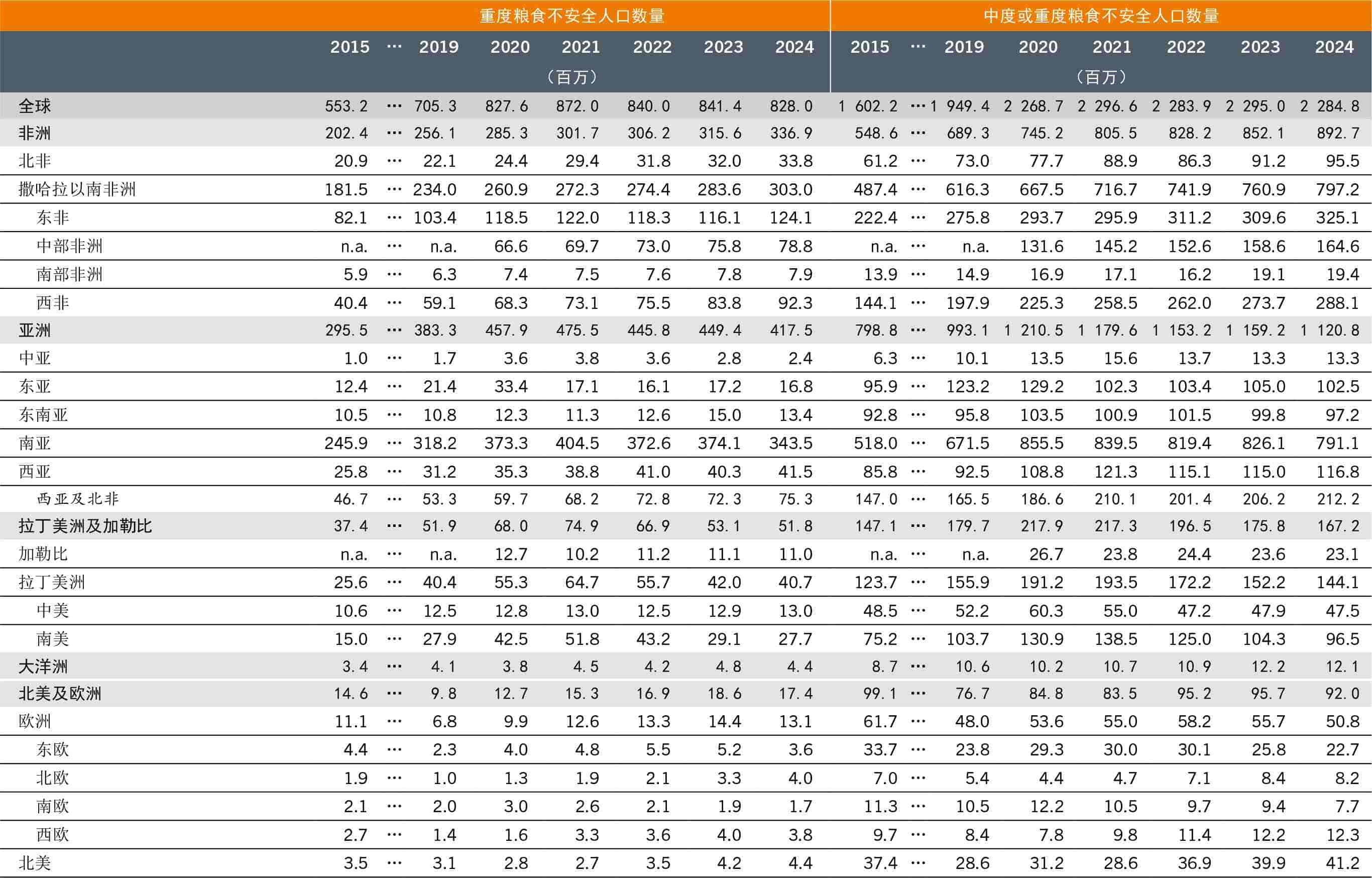 表2.42015–2024年基于粮食不安全体验分级表的重度粮食不安全人口数量以及中度或重度粮食不安全人口数量