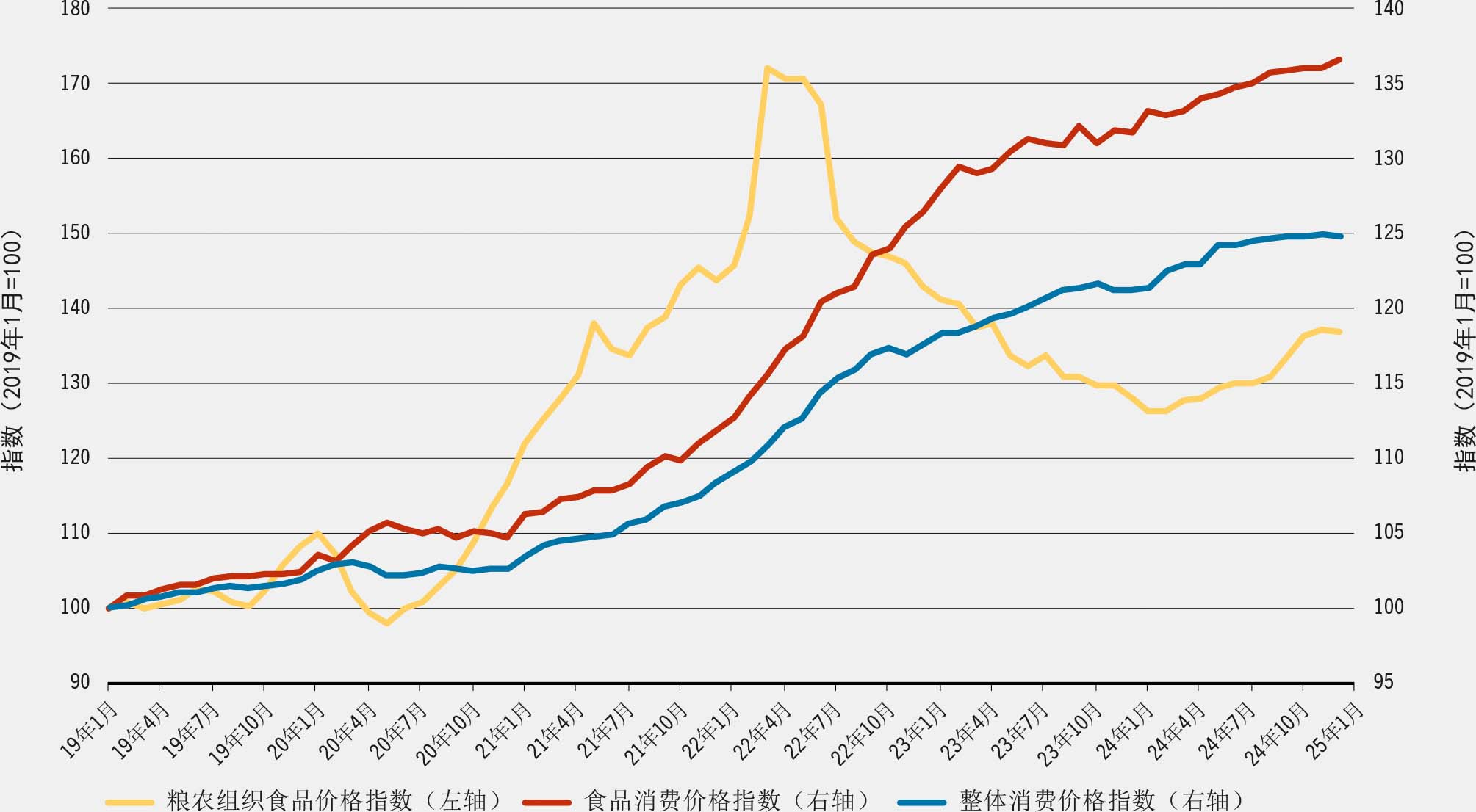 2020年中至2022年初,采用粮农组织食品价格指数衡量的国际农产品价格急剧上涨。此轮价格飞涨随即引发全球通胀上行,初期由外部冲击所致,后期源于国际价格变化向国内市场传导的滞后效应。2022年春季,随着全球农作物收成好转、乌克兰战争初期冲击逐渐消化、出口限制等贸易管制措施相继解除,国际市场开始趋稳向好。尽管商品市场已趋稳定,但国内通胀依然持续攀升,反映出成本传导存在时滞效应。2024年末,全球市场迎来更大范围的企稳回升态势。