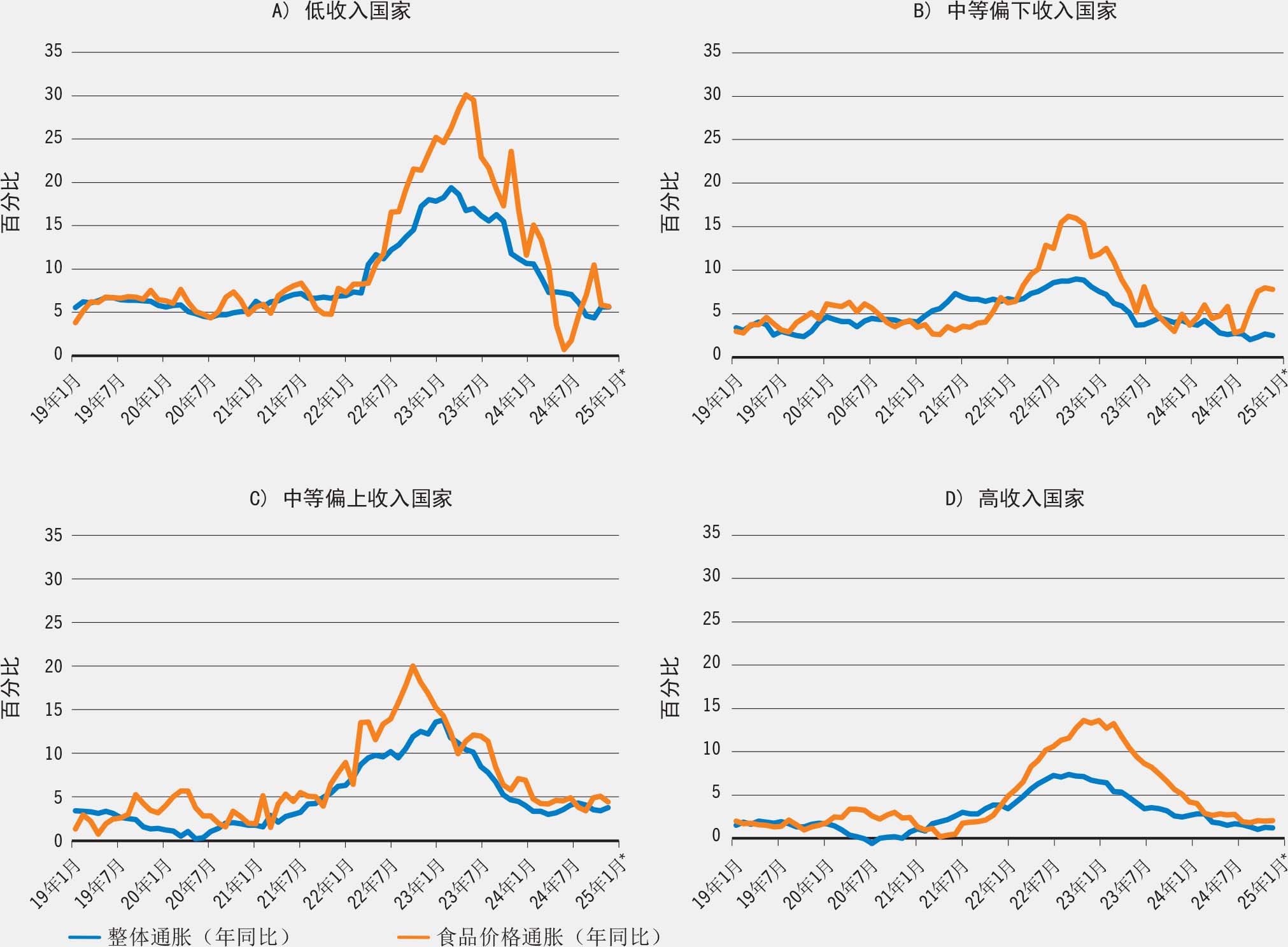 中等偏下收入和中等偏上收入国家同样经历了食品价格通胀率大幅攀升,只是上涨幅度较低收入国家相对温和。在中等偏下收入国家,食品价格通胀率于2022年9月触及约16%的峰值,随后逐步回落;中等偏上收入国家呈现类似趋势,食品价格通胀率峰值于2022年10月逼近20%。尽管期间有所回调,但食品价格通胀始终显著高于整体通胀水平,反映出以上两组国家中食品供应链的结构性缺陷和市场动态变化。