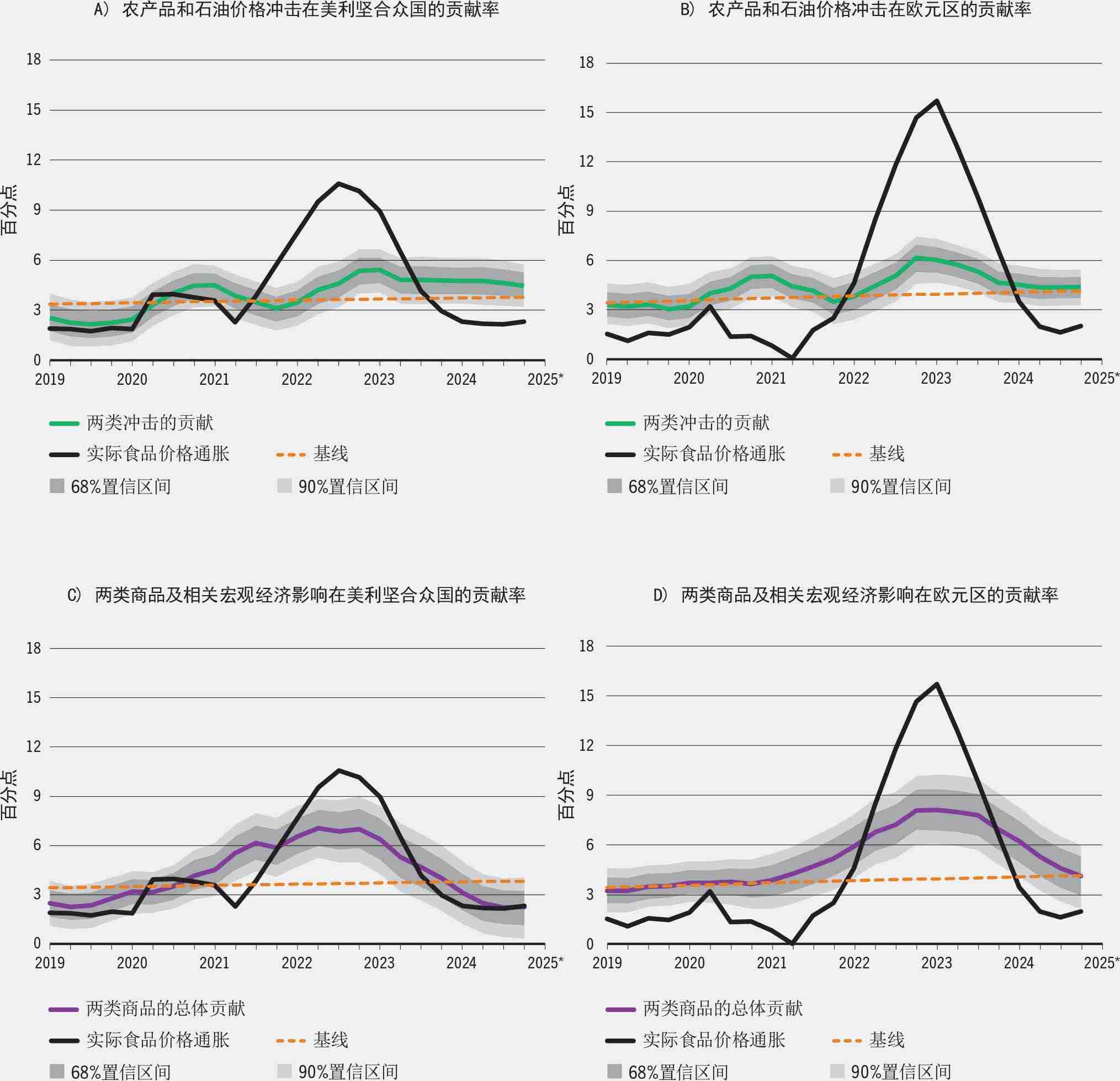 随着供应链中断与地缘政治紧张局势(特别是乌克兰战争)持续发酵,供给侧因素影响日益凸显,推动通胀压力走向长期化。因此,尽管需求侧冲击在初期占据主导,但接踵而至的供给侧约束令形势愈发复杂,凸显出本轮食品价格通胀中供需两侧冲击错综复杂且彼此交织的特征。供给侧冲击的影响因地而异,对欧元区的冲击力度往往大于美利坚合众国。89, 106