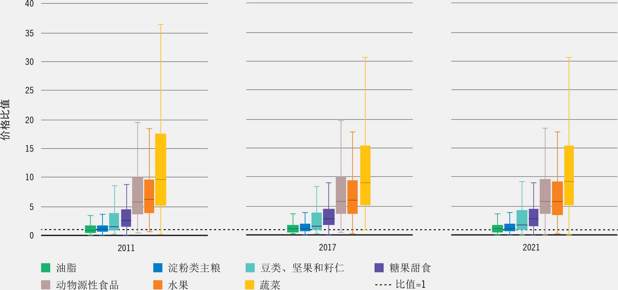 全球价格数据显示,基础淀粉类主粮与较高营养食物组别每千卡能量价格长期存在差异,对膳食质量和可负担性构成重大影响。本小节基于国际比较项目数据,分析不同食物组别的平均价格趋势,特别是计算不同食物组别相对于基础淀粉类主粮的价格比值。基础淀粉类主粮(例如谷物、面粉、大米、块根类)属于未加工或微加工(即NOVA 1类)主粮,通常是低收入消费者最主要的能量来源。特定食物组别的平均价格与基础淀粉类主粮价格之间的比值能反映相对于低成本膳食能量主要来源,购买各类食物需要承担的额外经济负担。分析基于国际比较项目2011年、2017年和2021年三轮可用数据。尽管可用数据稀缺,但仍能据此研判长期趋势特征。此外,还基于第3.4.2节介绍的三个国家案例,开展了更为细致的补充分析。正如图3.11所示,在国际比较项目涵盖的十年周期及所有国家中,基础淀粉类主粮始终是成本最低的膳食能量来源。ai相比之下,蔬菜、动物源性食品和水果等更高营养食物组别的价格持续位居高位。2021年,全球蔬菜平均价格是基础淀粉类主粮的11.9倍,动物源性食品和水果的平均价格分别是基础淀粉类主粮的9.1倍和7.2倍。即便是豆类、坚果和籽仁(3.1倍)和糖果甜食等较低营养类别(3.7倍),与基础淀粉类主粮相比也呈现出显著溢价。这种长期价差突出表明,很多家庭获取健康膳食的经济能力不足。此外,动物源性食品、水果和蔬菜、豆类等价格较高的高营养食品对满足婴幼儿营养需求至关重要。154
