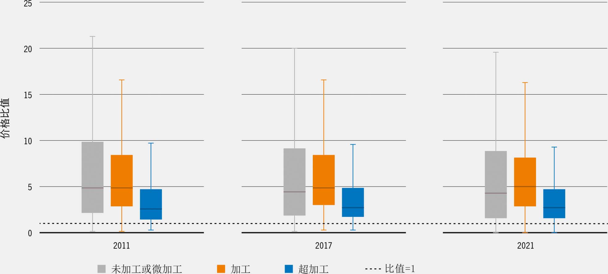 尽管超加工食品不利健康的证据日益确凿,但消费量却仍持续攀升。此类产品含有烹调时极少使用的成分和具有调质功能的添加剂(例如增味剂、着色剂、甜味剂),采用挤压成型、模具定型和预油炸等机械及其他工业工艺生产,往往含有大量糖、脂肪和盐,普遍缺乏天然膳食纤维、植物化学物及其他生物活性化合物等多种有益营养成分。176频繁食用超加工食品会引发一系列非传染性疾病及健康风险,包括肥胖、糖尿病、代谢综合征、心血管疾病、某些癌症和精神健康障碍,178–187已对公共卫生与食品政策构成重大挑战。尽管对健康有诸多负面影响,但超加工食品的全球消费量只增不减。188–190多重因素共同驱动了其消费量增长,例如适口性强、食用方便、供应充足、保质期长和吸引力大(密集营销的结果)。191–94超加工食品低廉的价格优势或许也起到了推波助澜的作用。尽管食物组别内部存在差异,aj但2021年超加工食品的价格平均比未加工食品或微加工食品低47%,比加工食品低50%ak(图3.12)。