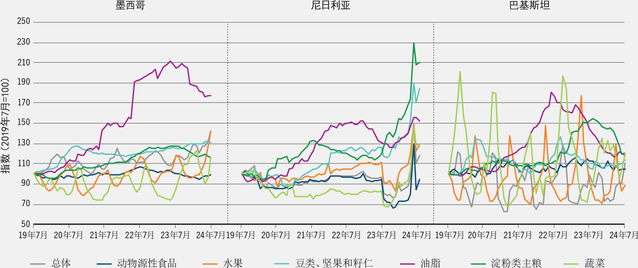 通过聚焦实现健康膳食所需的每个食物组别中最低价格选品,可发现通胀对其成本的影响呈现差异。截至2023年中,尼日利亚最低成本健康膳食的成本持续下降,但到分析期末出现回升。巴基斯坦此项成本起伏不定,很可能由季节性波动所致。相比之下,墨西哥最低成本健康膳食的成本持续走高。由此可见,即便在高通胀期,各国食品实际成本和最低成本健康膳食的成本也可能大相径庭。