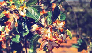 Apple flowers damaged by frost depicting darkened petals a few days after a frost event in an orchard in Northern Portugal (photographer: António Castro Ribeiro)