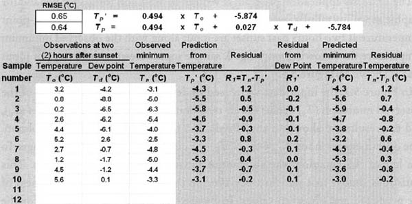 In Figure 5.3, the input data were used to determine a linear regression of the observed minimum (Tn) versus the air temperature at two hours past sunset (T0), and the results are shown in the "Prediction from Temperature (Tp')" column. The output equation for T' = b1 × T0 + a1 is shown at the top of the page. To the left of the equation, the root mean square error (RMSE) is shown. This statistic is similar to a standard deviation in that it is a measure of closeness of the predicted and observed values. In Figure 5.3, the RMSE is 0.65 °C for the formula based on the two hours past sunset temperature only. This implies that one deviation about the 1:1 line is approximately 0.65 °C, and two deviations about the 1:1 line would be about 1.3 °C. Assuming that the variation of the RMSE is about the same as a standard deviation, this means that the variation about the 1:1 line would be less than 1.3 °C about 85 percent of the time. After calculating Tp', the residuals (R1 = Tn - Tp') are calculated and displayed. Then, a linear regression of R1 versus the dew-point temperature (Td) is computed and the predicted residual (R1') values are shown. If Tp' = b1 × T0 + a1 and R1'= b2 × Td + a2, then the forecast minimum temperature is given by: Tp = Tp' + R1' = b1 × T0 + b2 × Td + (a1 + a2). In the Excel program, the output equation Tp = b1To + b2Td + a3, where a3 = a1 + a2, is displayed at the top of the input-calculation table for easy viewing. Again, the RMSE comparing observed and predicted minimum temperatures is shown to the left of the equation. In this particular data set, the RMSE values were nearly identical for both prediction equations, so there was no apparent advantage from including the dew-point temperature to predict the minimum temperature with this data set. However, including the dew-point temperature in the model will typically improve the prediction.