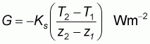 where T1 is the temperature at depth z1 and T2 is the temperature at depth z2, which is farther from the surface. The minus sign is included to make G positive when the flux is downward. The thermal conductivity is a measure of how fast heat transfers through the soil and the heat capacity is a measure of how much energy is needed to raise the temperature by 1 °C. The diffusivity (kT) in m2 s-1, which is a measure of how fast temperature will propagate through the soil, is given by: