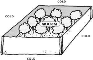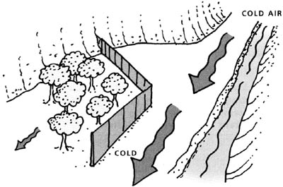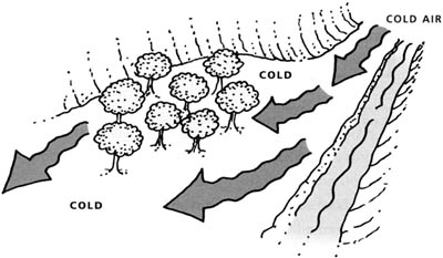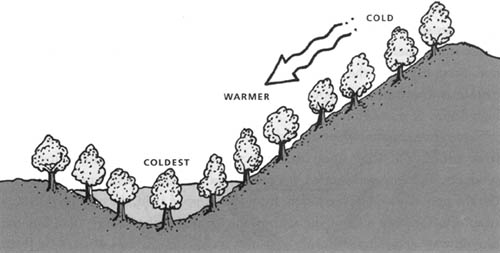 Cold air is denser than warm air, so it flows downhill and accumulates in low spots much like water (Figure 6.4). Therefore, one should avoid low-lying, cold spots unless adequate cost-effective, active protection methods are included in the long-term management strategy. This is important on both a regional and farm scale.