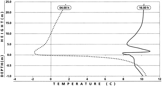 Figure 6.8 shows a soil temperature profile near sunset (1600 h) and at 0400 h during a spring-time frost night in an apple orchard in Northern Portugal. There was little change in temperature below about 0.3 m depth in the soil and most of the temperature change occurred near the surface. The air temperature to 1.5 m height at 0400 h was nearly isothermal, but above that level it increased with height to about 2 °C at 24 m height.