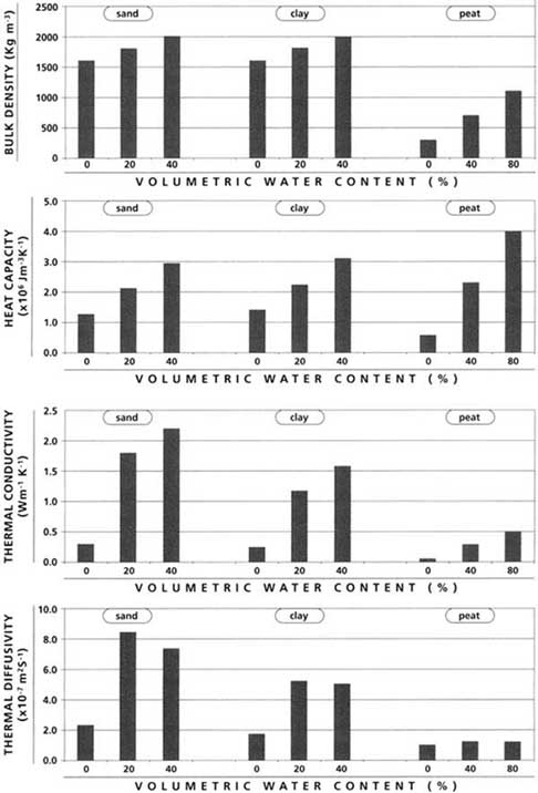 Thermal conductivity and heat content of soils are affected greatly by the soil water content, and considerable differences in thermal conductivity and heat capacity are observed between dry and moist soils (Figure 6.9). Almost all papers on frost protection recommend keeping the upper layer of soil moist but not saturated. Snyder, Paw U and Thompson (1987) recommend wetting to a depth of 30 cm because diurnal temperature variation is insignificant below 30 cm. The amount to apply varies according to soil type and antecedent water content. Normally, 25 mm for light (sandy) soils to 50 mm for heavy (clay) soils are sufficient.