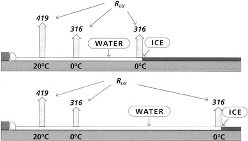 Furrow irrigation should be started early enough so that the water reaches the end of the field before the air temperature falls to the critical damage temperature. Water at 20 °C will radiate 419 W m-2 of energy, whereas water or ice at 0 °C radiates 316 W m-2 of energy. Also, the warmer water will transfer more heat to the nearby air, which will transfer vertically into the plant canopy. Ice formation on the water surface insulates the transfer of heat from the water and reduces protection. With a higher flow rate, the ice formation will occur further down the row (Figure 7.14), so high application rates afford better protection. Cold runoff water should not be recirculated. Heating the water is definitely beneficial for protection; however, heating may or may not be cost-effective. It depends on capital, energy and labour costs compared with the potential crop value.