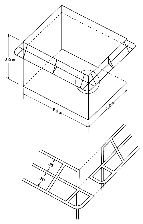Floatation of the cages is provided by cylindrical shaped styrofoam, 30 × 60 cm in diameter and 60–120 cm in length or box-shaped styrofoam (50× 50 × 100 cm). Plastic containers have also been used as floats for demonstration purposes.