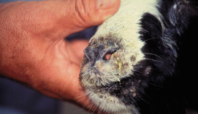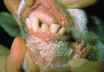 Dans les cas les moins graves de la maladie, ces lésions peuvent passer inaperçues et un examen très approfondi est alors nécessaire pour les déceler. En passant les doigts sur la face interne de la joue et du palais, on enlève facilement le tissu nécrosé, nauséabond. Les foyers de nécrose peuvent être présents au niveau des muqueuses nasales, de la vulve et du vagin chez les femelles. Les lèvres sont généralement enflammées, fissurées et couvertes de croûtes (figure 5).