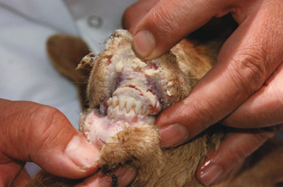 À un stade avancé de la maladie, une haleine fétide se dégage de la bouche. Les animaux malades ont alors tendance à garder la bouche ouverte à cause de la forte douleur qu'ils ressentent.