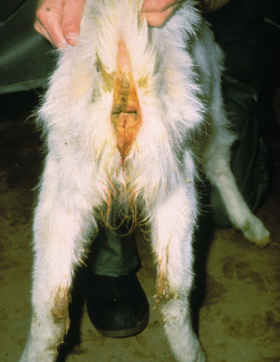 Au cours des premiers stades de développement de la maladie, ou dans les cas un peu moins graves, la diarrhée peut ne pas apparaître. En général, elle survient deux à trois jours après le début de la fièvre (figure 6). Les matières fécales sont molles au début, puis deviennent de plus en plus liquides, d'odeur nauséabonde, striées de sang et elles renferment parfois des lambeaux de tissus nécrosés. Quand la diarrhée n'est pas apparente, l'introduction d'un coton tige dans le rectum peut révéler l'existence de matières fécales molles, pouvant contenir du sang.