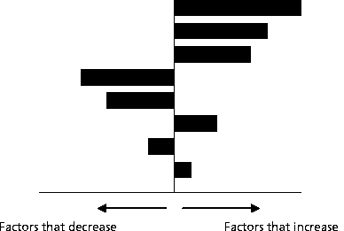 Some risk assessments present the sensitivity analysis as a chart with bars representing the extent of the impact each parameter has on risk. A typical chart is shown below, and because of its shape it is usually called a "Tornado chart"; each bar refers to a particular property that is correlated either with increased or decreased risk.