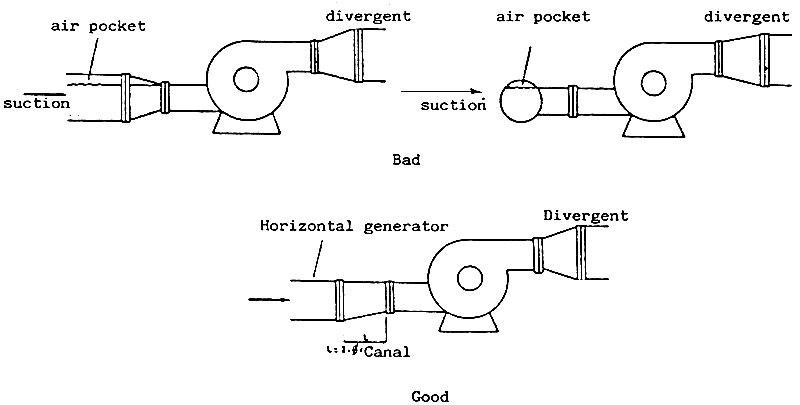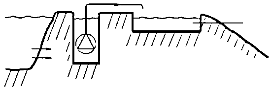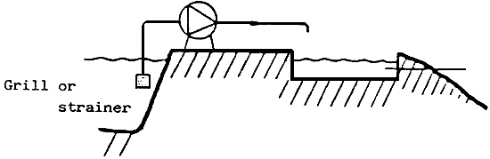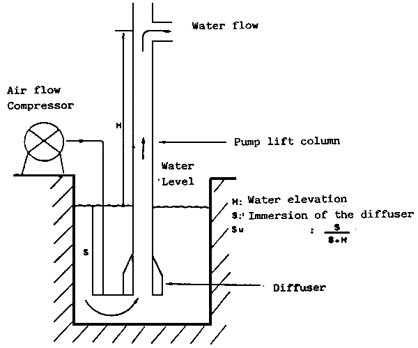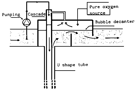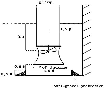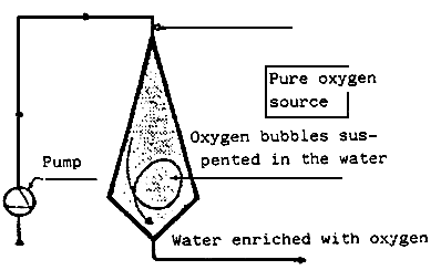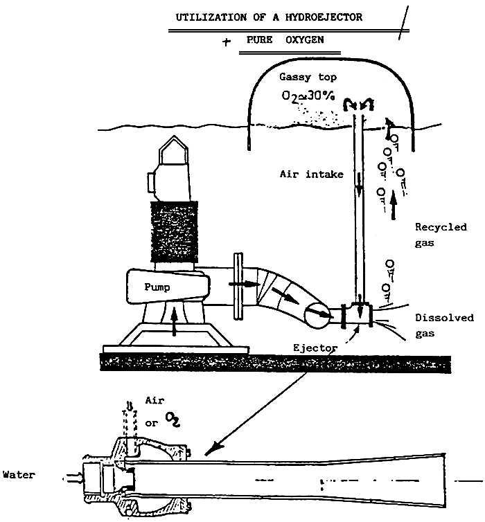 This first three types of pure oxygen device, shown in these diagrams, are placed on pumps for small outflows normally (Incubation, fry culture, fish preserve). These three other pure oxygen devices permit treating important outflows. They all have a casing which from a watertight insulator, for example covering the intake canal. This closed space allows the recuperation of the oxygen which was not dissolved in the first flow and to recycle it in the dissolution device.