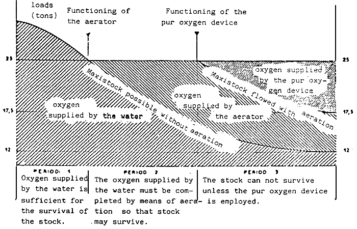 - The management of oxygen in fishculture where the flow decreases greatly in summer, and where the objective is to maintain 25 tons of trout, which are fed normally, in stock. When there are good flows, the oxygen which the water contains normally suffices for the consumption of 25 ton of fish (1 period). In the second period, the flow decreases, and it becomes necessary to start operating the aerators. The flow continues to decrease the aerators reach their limit of performance, and a complementary oxygen supply by means of a pur oxygen device most be employed (period 8). This grappe cover a period of 6 months. In the example it has been assumed that the temperature of the water stays the same the year round. Thé importance of aeration and oxygenation would be greater if we have to take in account an increase of to higher temperatures.