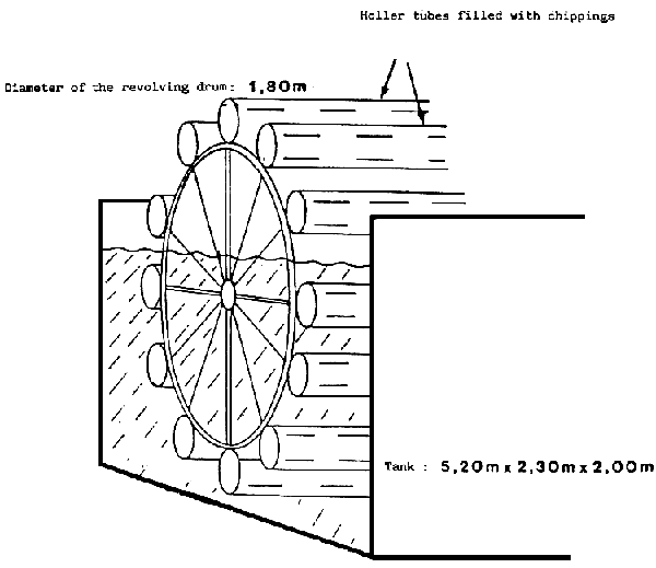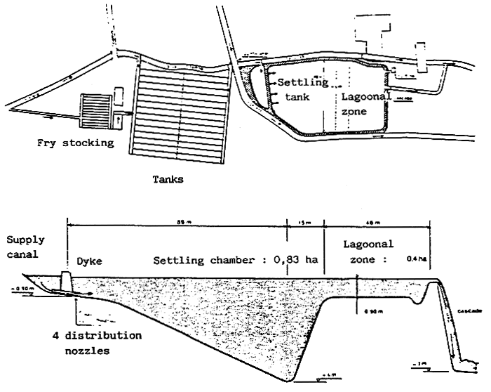 Section on the purification structure. The tests carried out in the lagoonal cone (plantations) have shown that much bigger surfaces should be scheduled with the aim of treating ammonia by this method. The settling chamber proves quite satisfactory (LOISTEL).