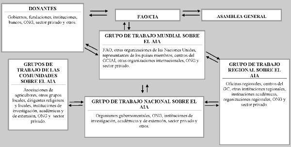 44. Para lograr sus objetivos, el Año Internacional del Arroz debe adoptar un enfoque participatorio, consultivo, innovador y proactivo, que reconozca la capacidad y habilidad de todas las partes interesadas a todos los niveles. Para sincronizar los esfuerzos a nivel mundial, regional, nacional y local, el Año Internacional se observará dentro de un marco del Año Internacional del Arroz. Como organización rectora designada para el Año Internacional, la FAO ha establecido una dependencia de coordinación y puesta en ejecución del Año Internacional del Arroz, a fin de que ayude a coordinar las actividades dentro del marco del Año Internacional a todos los niveles. A nivel mundial, la coordinación de las actividades del Año Internacional será competencia del Grupo de Trabajo Internacional Oficioso del Año Internacional del Arroz., establecido en la reunión oficiosa de planificación y coordinación internacional y acogido por el Servicio de Cultivos y Pastos de la FAO. El marco para la puesta en ejecución del Año Internacional del Arroz a diferentes niveles, desde el mundial hasta el de las comunidades, aparece en la Figura 1.
