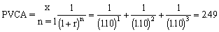 If the constant annuity is $500, its total present value is $1245 (= 500 x 2.49). Thus a constant stream of benefits or costs for any length of time in the future can be reduced to its present value by using the PVCA.
