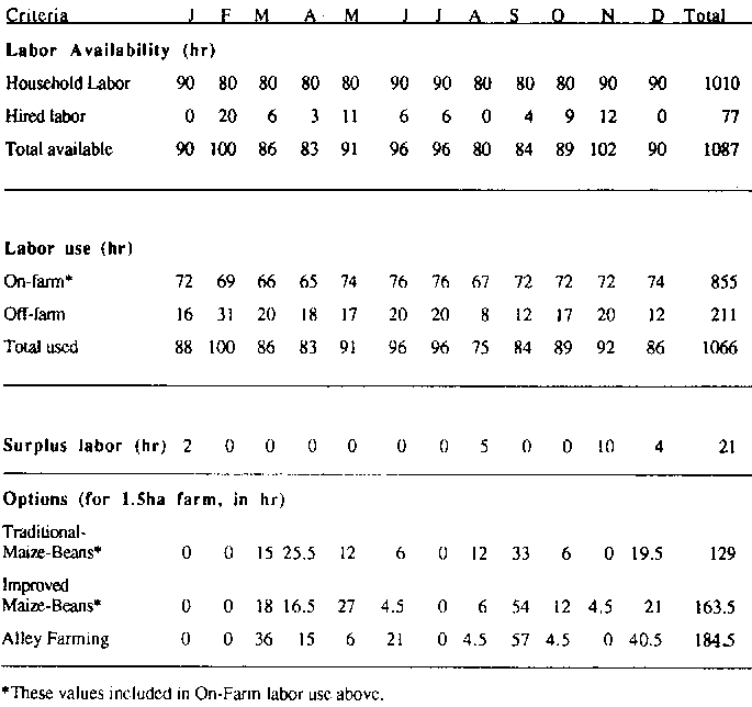 As mentioned before, we shall be comparing three farm management options, namely, traditional maize-beans, improved maize-beans, and alley farming technologies. Tables 1, 2 and 3 present measurements of labor use and commercial inputs for the three options.