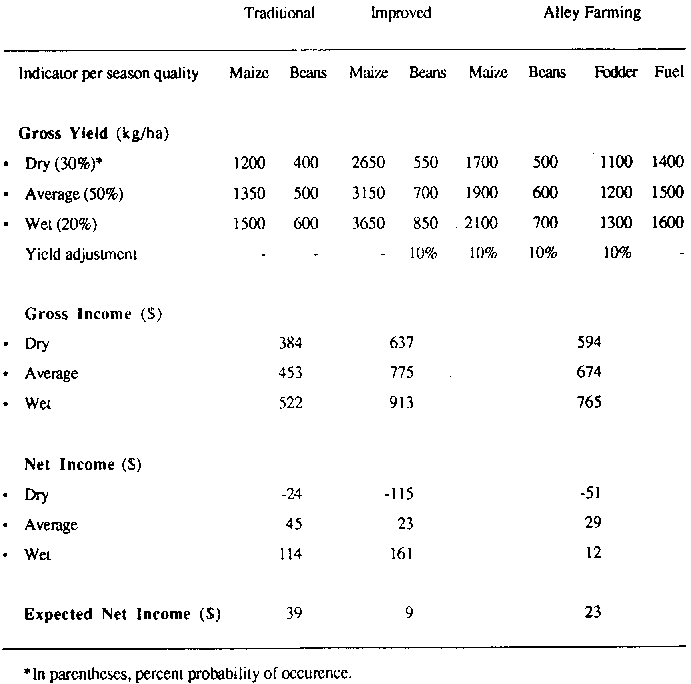 Since not all the biophysical and other coefficients in the hypothetical data are based on validated evidence, these results should not be used to make conclusive statements on the economic worthiness of the alley farming system. However, these coefficients can be assessed and their precision improved using new or site-specific research results. The basic procedures used in this exercise provide a useful guideline as to the type of data required, basic questions and issues to be addressed, and appropriate interpretations for the economic assessment of alley farming.