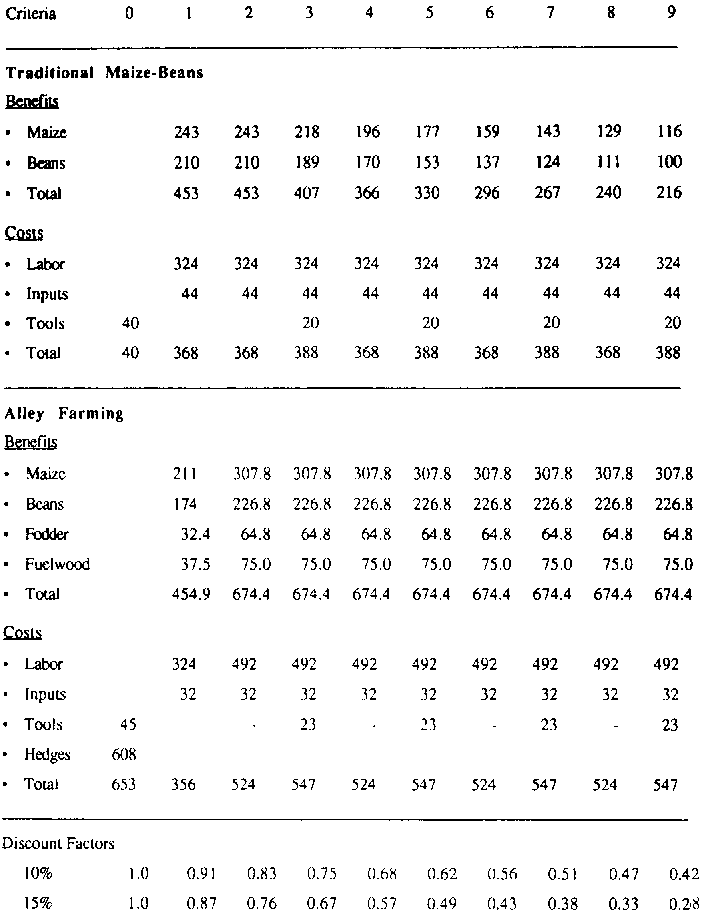 These calculations indicate that alley farming offers greater net profits and equal or improved benefit/cost ratios than the traditional system. The indicators are particularly favorable for alley farming at a discount rate of 10%.