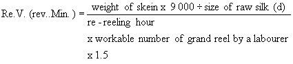 For the calculation of the re-reelable quantity of raw silk by a grand reel for 8 hours, the following formula should be used.