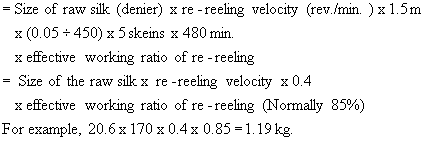 The standard of the re-reeling velocity (Re.V.) and the re-reelable quantity of the raw silk can be calculated according to the following formula.