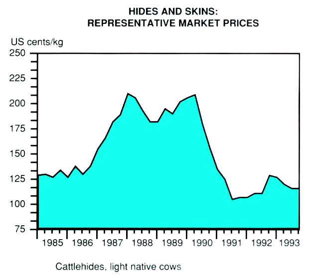 Chicago prices of light native cowhides continued to fall in 1992 reflecting depressed demand for leather and leather products in major consuming countries. However, prices tended to rise towards the end of 1992 and in 1993 stimulated by decreased supplies of hides and skins and modest recovery of tanning activities in the Asia and the Pacific region.
