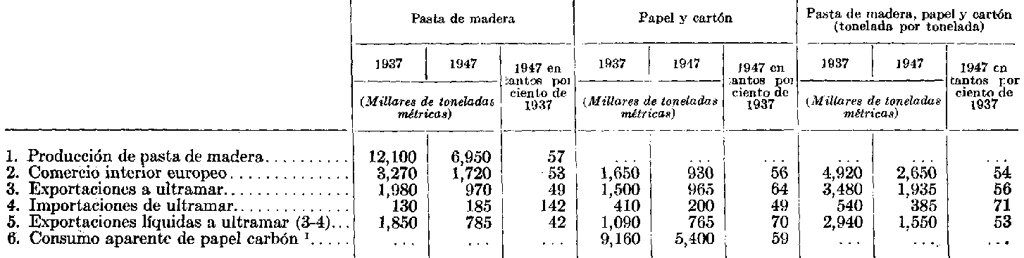 La mengua de provisiones totales asequibles a Europa en conjunto, en los momentos en que la demanda de madera aumenta notablemente, ha ido acompañada, para colmo de males, de un cambio completo en las prácticas corrientes del comercio. Sobre todo, las exportaciones de la U.R.S.S. (que antes de la guerra llegaban a casi la tercera parte de las exportaciones totales de los países europeos) prácticamente han cesado, y las exportaciones de otros países del oriente de Europa han disminuído considerablemente. Asimismo los países del norte exportadores de madera, que no fueron devastados por la guerra o que lo fueron sólo en menor grado, han reservado para su propio consumo una proporción mayor de sus producciones disminuidas.