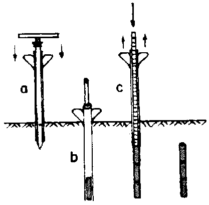 Post-hole method. An effective way to blast deep ditches, especially in heavier, compact types of soil, post-holing consists in placing charges of several pounds in auger-drilled holes, at two thirds the depth of the required ditch and spaced 0.9 to 1.2 meters apart, depending on the charge. The loads are fired by propagation or by individual ignition (detonating fuse, electric caps). Because of its fewer but heavier charges per unit length as compared with the other two methods, post-holing is a suitable ditch blasting method in dry conditions, where all individual charges must be ignited (Figure 5c).