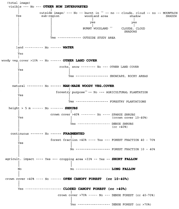 In this case study, based on two Landsat frames located in the north of Cameroon, digital interpretation techniques were compared to the visual approach followed by the FAO FRA 1990 Project.