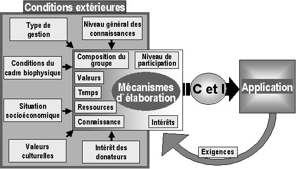 Bien que les C et I se proposent d'évaluer2 la situation des forêts et de leur gestion, ils se différencient au plan du contenu et de la structure, en raison des conditions de base particulières qui sont responsables de leur élaboration. Pour classer les raisons de cette diversité, Pokorny et al(2002) identifie trois groupes de facteurs comme le montre la figure 1 : 1) les différentes conditions extérieures au cadre, y compris les facteurs qui influencent indirectement les individus participant au processus d'élaboration des C et I ; 2) les caractéristiques du processus d'élaboration des C et I, y compris les conditions particulières de travail et les attributs des individus3 directement impliqués ; et 3) les exigences posées par l'application des C et I vis-à-vis des ressources financières et humaines, ainsi que des contraintes temporelles4.