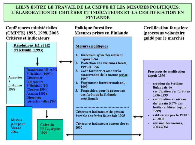 Annexe : Schéma des liens entre le travail de la CMPFE et les mesures politiques, l'élaboration de critères et indicateurs et la certification en Finlande