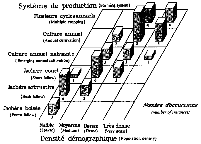 Ce concept de l'intensification est donc sensiblement plus ouvert que le concept propre aux agronomes, qui peut se définir comme l'accroissement de l'emploi des facteurs visant à améliorer la productivité sur une même parcelle. Ce concept s'appuie sur la classification des systèmes de production agricole tropicaux par degré croissant d'intensification (Ruthenberg, 1980):