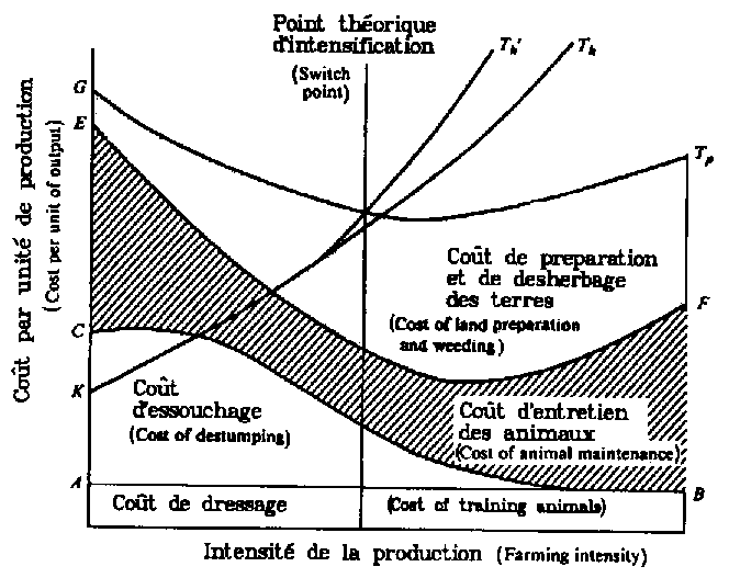 Il y aurait donc un point théorique d'intensification (switch point) où la traction animale devient plus rentable que la culture manuelle, et qui se situe autour du stade de la jachère herbacée. Rendue possible par le défrichement et la disponibilité du bétail de trait, la traction animale doit nécessairement remplacer un travail manuel de plus en plus pénible pour contrôler l'enherbement des cultures. La traction animale devient aussi nécessaire pour lutter contre la baisse des rendements liée à l'intensification, baisse causée par la réduction des temps de jachère et la baisse des restitutions minérales par brûlage.