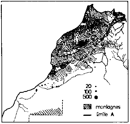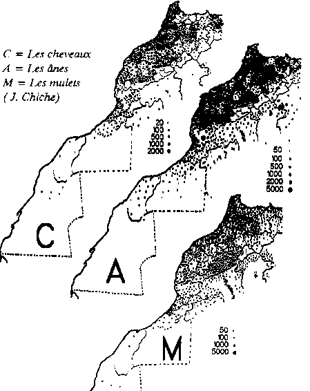 L'analyse des travaux de préparation du sol réalisée au Maroc montre que 25% des superficies sont travaillées à l'araire et 78% des exploitations ne sont pas mécanisables du fait de leur structure foncière morcelée, de la topographie locale, du mode de faire-valoir ou de la nature du terrain. Ce nombre important d'exploitations indique à quel point la traction animale est ancrée dans le milieu rural, touchant en fait 78% des foyers ruraux. Au niveau des effectifs, notons la prédominance des ânes (723.700) et des mulets (445.000). Les petits équidés ont l'avantage d'être d'un entretien peu coûteux et d'un emploi versatile, servant aussi bien au labour, au sarclage, qu'au transport de l'eau et des grains. De plus, ils peuvent être confiés à des enfants dès l'âge de sept ans. Les chevaux (15.700) sont concentrés dans les zones au relief de plaine (Fig. 1).