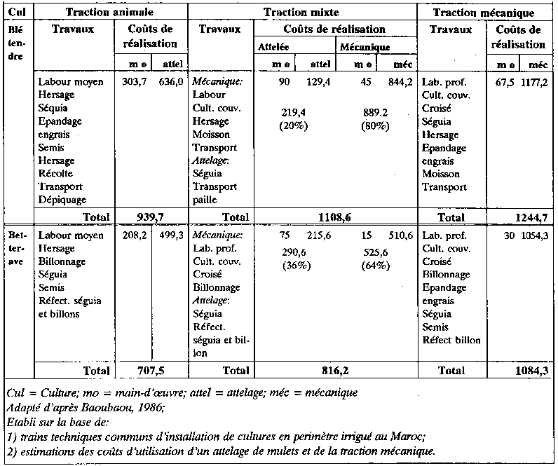 A partir de ces données, l'analyse comparative des différents itinéraires en traction animale intégrale en traction mixte et en traction mécanique intégrale, effectuée sur deux cultures hypothétiques de blé tendre et de betterave sucrière montre que la traction animale reste toujours (en intégrant la main-d'uvre associée) la plus intéressante pour les petites exploitations disposant d'une main-d'uvre familiale permanente. Les coûts de la main-d'uvre familiale sont rarement comptabilisés lors des opérations culturales réalisées en traction animale. Les coûts de mise en culture d'un hectare de blé tendre en TA peut ainsi être évalué à 636 Dh, alors que les mêmes travaux coûteraient 1.177 Dh en motorisation. Dans le cas d'un hectare de betterave, les coûts en traction animale s'élèvent à 499 Dh contre 1.054 Dh en traction motorisée.