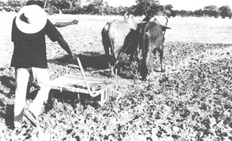 The main aim of soil cultivation in semi-arid regions is the retention of rain-water in the soil, even in small quantities. The limited use of plowing in wet soil and the virtual impossibility of plowing in dry soil in the Sahelian regions south of the Sahara led CEEMAT to develop new animal-drawn cultivation implements with draft requirements appropriate to the animal teams used in the region. The CEEMAT tine was designed to have low tractive force requirements and yet cultivate deeply in dry, compacted soil in order to facilitate infiltration of the first rains. The CEEMAT rolling cultivator (Roliculteur) is for surface cultivation on damp soil and was designed to limit weed growth and preserve soil water by creating mulch effect. It is a wide implement, cultivating an area three times wider than that worked by a plow. Preliminary trials in a laboratory soil bin provided data on the shape, dimensions and distance between the blades of the rolling implement. Trials were then conducted under field conditions using draft animals in Bostwana (1986-1987) and in Burkina Faso (1987) where the working characteristics of the implements, tractive forces and animal speed were evaluated. An instrument package developed by AFRC-Engineering was used to record and analyse work results and mechanical data. In addition, the effect achieved by the cultivation process was evaluated visually (by counting clods) and by means of a profilometer. These trials indicated the very clear superiority of the rolling implement over fined implements for surface cultivation (limited and regular tractive forces, no blocking in grass-covered soil). The most satisfactory set up was a double gang ("offset") configuration. The first prototypes of the tines with or without fins proved inappropriate for cultivation of dry soil. New designs were tested The "RR" tine proved to be most satisfactory. Problems of wear made it necessary to select the most abrasion-resistant steels.