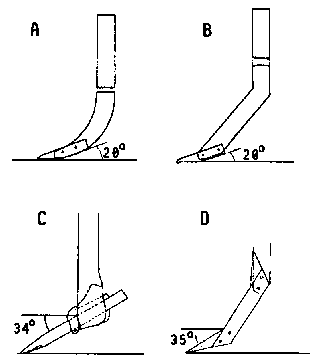 Ces travaux ont donné naissance à de nouvelles formes de dents, en particulier une dent réversible à ressort (RR) en acier mangano-siliceux de section 50 x 5 mm, travaillant à la manière d'un coutre très étroit (5 mm) et dont la pointe a un angle d'entrure de 35° (Fig. 1).