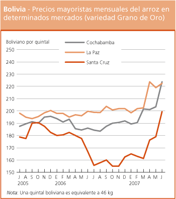 La recolección de la cosecha principal de trigo de invierno y de la primera cosecha de arroz de 2007 está casi terminada en toda la subregión, mientras los preparativos de la tierra y la siembra de las cosechas principales de arroz y cereales secundarios han comenzado con la llegada generalmente oportuna de las lluvias monzónicas. En los países situados en torno a la franja ecuatorial, la temporada principal del arroz está muy avanzada. En China, la recolección de la cosecha de trigo de invierno de 2007 prácticamente ha terminado bajo condiciones favorables. La producción total del país, que incluye aproximadamente 5,5 millones de toneladas de trigo de primavera, se estima ahora provisionalmente en un nivel sin precedentes de 107 millones de toneladas, 2,5 millones de toneladas más que el récord alcanzado el año pasado. También han sido favorables las condiciones atmosféricas para la siembra de los cereales secundarios (principalmente maíz), que está terminada en las principales regiones productoras. Está prevista una abundante producción de maíz de 149 millones de toneladas, 3,5 millones de toneladas más que la producción elevada del año pasado, debido a un aumento de la superficie dedicada al cultivo, que debería ser relativamente más rentable que la soja, el sucedáneo normal. Con respecto al arroz, está en curso la recolección de la cosecha temprana de 2007, mientras acaba de terminarse la siembra de la cosecha intermedia. A finales de junio ha comenzado la siembra del arroz tardío. En base a los pronósticos oficiales, se prevé que la superficie total de arroz aumente en 2007 en un 1 por ciento en comparación con el año anterior, gracias al alza de los precios del arroz (debido principalmente a los precios mínimos de compra del Gobierno) y a la concesión de subvenciones directas del Gobierno a los productores de cereales. Sin embargo, la producción puede verse afectada por las inundaciones registradas últimamente en las zonas arroceras principales. En la India, la recolección de la cosecha de trigo de 2007 estaba casi terminada a finales de junio y su producción se estimaba provisionalmente en un volumen abundante de 73,5 millones de toneladas, gracias a un aumento de la superficie plantada y al tiempo favorable imperante durante la mayor parte del período vegetativo. Como consecuencia, se prevé que las importaciones de trigo del país en 2007/08 disminuyan sensiblemente a alrededor de 3 millones de toneladas, con respecto al nivel excepcionalmente alto de 6,6 millones de toneladas alcanzado en la campaña comercial anterior. Ha comenzado la siembra de las cosechas principales de cereales secundarios y arroz Kharif, que se recogerán a partir de septiembre. Las perspectivas iniciales son satisfactorias gracias a la llegada oportuna del monzón sudoccidental a la costa meridional del país y a las precipitaciones superiores a la media en un 7 por ciento recibidas en junio. Sin embargo, los resultados de la campaña Kharif dependerán mucho todavía del comportamiento de las lluvias monzónicas sudoccidentales en julio y agosto. En Indonesia, las perspectivas para la producción arrocera de 2007 pueden disminuir ligeramente respecto del nivel excelente del año anterior a causa del retraso de las lluvias; en cambio, se prevé una cosecha mayor de maíz. Se pronostica que la producción aumentará a alrededor de 12,4 millones de toneladas debido a un uso mayor de semillas híbridas de mayor rendimiento. También ha concluido la recolección en las principales provincias productoras del Pakistán, y la producción nacional en 2007 se estima ahora en un nivel récord de 23 millones de toneladas. La producción se ha visto impulsada por un tiempo favorable pero también por el uso mayor de fertilizantes que las subvenciones gubernamentales permitieron adquirir. Dada esta buena cosecha, se prevé que el país exporte en 2007/08 aproximadamente 1,5 millones de toneladas de trigo. En Filipinas, la producción arrocera del primer semestre de 2007 se estima oficialmente en un volumen sin precedentes de 6,7 millones de toneladas, marginalmente superior al volumen del año pasado, gracias a la abundancia de agua para riego y de las subvenciones gubernamentales para la compra de insumos. También se prevé elevada la producción de maíz en 2007, semejante al nivel sin precedentes de alrededor de 6,3 millones de toneladas del año anterior. La producción de los tres primeros meses del año se estima en 1,7 millones de toneladas, un 11,4 por ciento más que el año anterior, gracias al aumento de la superficie plantada debido al incentivo de los precios altos. Pero se prevé que en el período comprendido entre abril y junio la producción de maíz descienda algo a alrededor de un millón de toneladas tras una probable disminución de la superficie plantada debida a las lluvias menores recibidas en febrero y marzo en Mindanao, una región productora importante. En Bangladesh, a diferencia de las condiciones generalmente favorables imperantes en la mayoría de las otras partes de la región, la cosecha de trigo de 2007 se vio perjudicada por unas temperaturas invernales superiores a lo normal y la producción se estima muy por debajo de la media. Como consecuencia, se estima que en 2007/08 las importaciones del país aumentarán a casi 3 millones de toneladas, nivel muy superior a la media de los últimos cinco años.