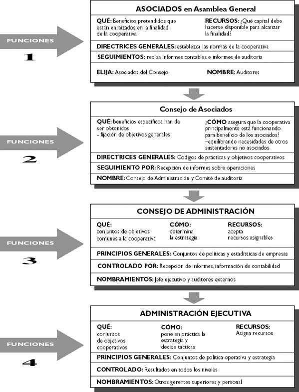 En cada cooperativa, ahí necesita una estructura a fin de asegurar: control efectivo y último permanece en manos de los asociados. La asamblea de asociados normalmente se investirá de ciertos poderes para ejercerlos en provecho de los asociados, incluyendo (Handel 1992: 92):