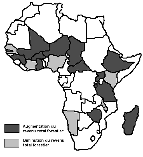 La majorité des recettes forestières perçues en Afrique sont recouvrées dans une poignée de pays. Près de 75 pour cent du montant total indiqué concerne la Côte d’Ivoire, le Ghana et la République centrafricaine. Tous ces pays sont situés en Afrique occidentale et centrale et ont de relativement grosses industries forestières axées sur l’exportation. Le Nigeria, le Liberia, le Sénégal et la R D du Congo représentent aussi une part importante du total et il est probable que d’autres pays similaires qui ne sont pas couverts par l’étude (ex: Cameroun et Gabon) auraient des totaux aussi élevés.