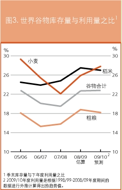 由于自7月份上次报告以来全球收成前景改善,粮农组织对2009年世界谷物产量的预测上调了近2600万吨。这使今年的产量仅比2008年创下的记录低2%。产量前景看好加之来自上年度的结转库存量较高,至少使对本年度总体供应形势的担忧有所缓解。虽然预计2009/10年度世界谷物利用量增幅大于先前预期(部分原因是价格趋弱),但供应量的增加仍将使世界谷物库存水平有小幅提高;预测到2010年结束的各年度季末世界谷物库存量将达八年来最高水平。全球供求关系总体改善还反映在世界谷物库存量与利用量之比上,这是全球粮食安全的一项重要指标,预计该比率仍将基本维持上年度高于平均水平的比值不变。出口价格的近期走势确认谷物市场回归较为正常的格局,但稻米除外,本年度到目前为止稻米国际价格比去年同期平均低了30%。与上年度的创纪录水平相比,价格回落及世界贸易量的大幅缩减有助于全球谷物进口费用的降低。在低收入缺粮国,由于许多国家增收,预测2009/10年度进口总量将减少13%,总体谷物进口费用可能降低27%之多,折合80亿美元。