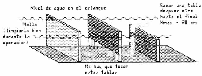 De esta manera es mas facil regular la entrada de agua, tomando agua de la superficie del canal y también durante el secado del estanque se ouede tapar la entrada con arcilla entre dos filas de tablas en 1 v Z.