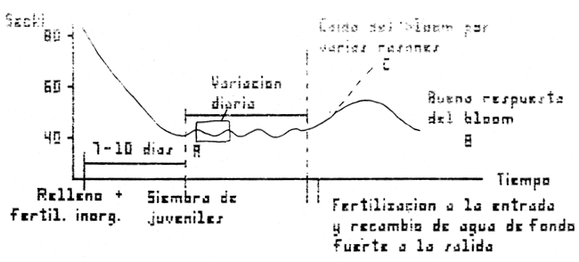 En caso de bloom fuerte Secki 60 cm hay que bajar el nivel durante la noche y subir el nivel durante la mañana y medir el Secki de nuevo durante la tarde.