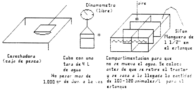 Una vez hecho el conteo, empezar a llenar con agua de los tanques (2 toneladas sobre la carreta) Por sifón y gravedad es la mejor manera, el flujo de agua será continuo y se regula facilmente. De esta manera las larvas se irán aclimatando en S%., T°C y pH.