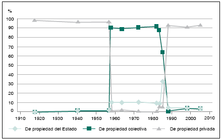 El período que media entre 1949 y los primeros años del decenio de 1980 estuvo caracterizado por la nacionalización y la colectivización: las tierras privadas fueron expropiadas; y al cabo de un tiempo relativamente breve, durante el decenio de 1950, el movimiento de las comunas había eliminado la propiedad privada de las tierras, incluida la de las tierras forestales. Como consecuencia, hubo entonces dos tipos de propiedad forestal: las explotaciones colectivas, las aldeas administrativas o los grupos de producción fueron propietarios y gestores del 58 por ciento de las tierras forestales; y el Estado fue propietario del 42 por ciento de las tierras forestales restante. En el decenio de 1960, la rigidez de este régimen conoció un leve aflojamiento, otorgándose a los hogares derechos de uso sobre pequeñas parcelas forestales en las zonas de montaña; pero esta liberalización concluyó en 1966 al comenzar la Revolución Cultural.